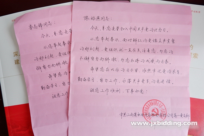 而后環(huán)節(jié),黨支部集體為支部黨員陳裕燕、李志鋒同志過“政治生日”。為進一步激發(fā)黨員干事創(chuàng)業(yè)的活力,招標公司第一黨支部決定于2019年4月12日起在支部內(nèi)開展“黨員政治生日”主題活動。5月25日和5月27日分別是陳裕燕與李志鋒同志加入中國共產(chǎn)黨的日子,恰逢主題黨日活動,支部委員黃震淼代表第一黨支部宣讀了組織寫給兩位黨員的生日寄語信,希望兩位黨員時刻牢記黨的宗旨,勤奮學(xué)習(xí),努力工作,永葆共產(chǎn)黨員的先進性。隨后,陳裕燕、李志鋒同志以飽滿的熱情一齊重溫了入黨誓詞,并表示將在今后的工作生活中時刻保持入黨初心,勤奮學(xué)習(xí),嚴于律己,以高度的責(zé)任感和使命感展現(xiàn)一名共產(chǎn)黨員良好的精神風(fēng)貌。
