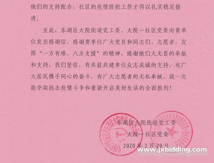 至此,東湖區(qū)大院街道黨工委、大院一社區(qū)黨委向貴單位發(fā)出感謝信,感謝貴單位廣大黨員和同志們、志愿者,發(fā)揮“一方有難、八方支援”的精神,感謝你們大無畏的奉獻和支持,我們堅信,有共駐共建單位眾志成城的支持,有廣大居民攜手同心的奮斗,有廣大志愿者的無私奉獻,就一定能奪取抗擊疫情斗爭和重新開啟美好生活的全面勝利!
