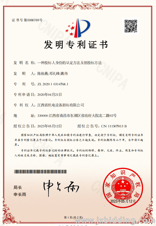 近日,江招公司申報的四項專利喜獲國家知識產(chǎn)權(quán)局授權(quán),它們分別是“多招投標(biāo)任務(wù)并行管理系統(tǒng)及招投標(biāo)方法”“一種基于廣域網(wǎng)的招投標(biāo)方法”“招投標(biāo)數(shù)據(jù)的快速交換方法及招投標(biāo)方法”“一種投標(biāo)人身份的認定方法及招投標(biāo)方法”,獲授權(quán)的四項國家專利是江招堅持走技術(shù)創(chuàng)新路線的智慧結(jié)晶和生動詮釋,標(biāo)志著江招公司業(yè)務(wù)質(zhì)量信息化管理能力和課題研究、成果運用和產(chǎn)業(yè)孵化能力又邁上一個新臺階,對于增強公司的市場競爭力和創(chuàng)新引領(lǐng)力有積極促進作用。