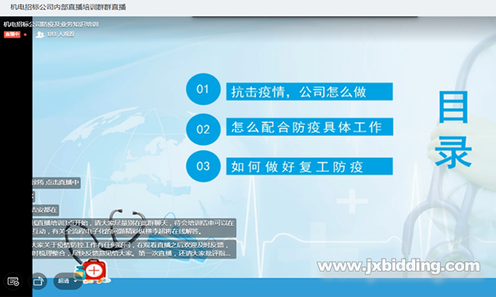 為進(jìn)一步加強(qiáng)公司職工對復(fù)工防疫知識的掌握,加快推進(jìn)全流程電子化平臺的使用,2月15日,江西省機(jī)電設(shè)備招標(biāo)有限公司組織開展了網(wǎng)絡(luò)直播培訓(xùn),對公司全體職工進(jìn)行了防疫工作指南及全流程電子化招標(biāo)知識培訓(xùn),公司......